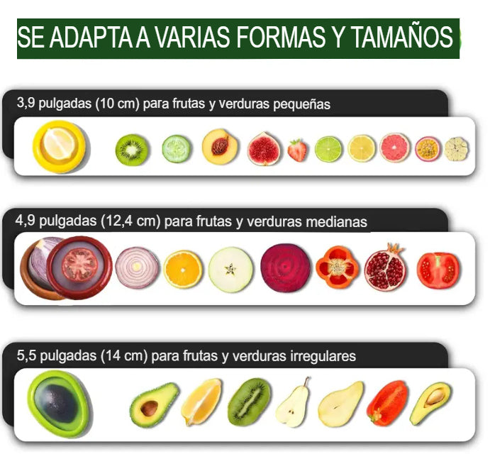 No importa si tus alimentos son pequeños, medianos o irregulares: nuestras tapas ecológicas se ajustan perfectamente para mantener la frescura y evitar desperdicios.